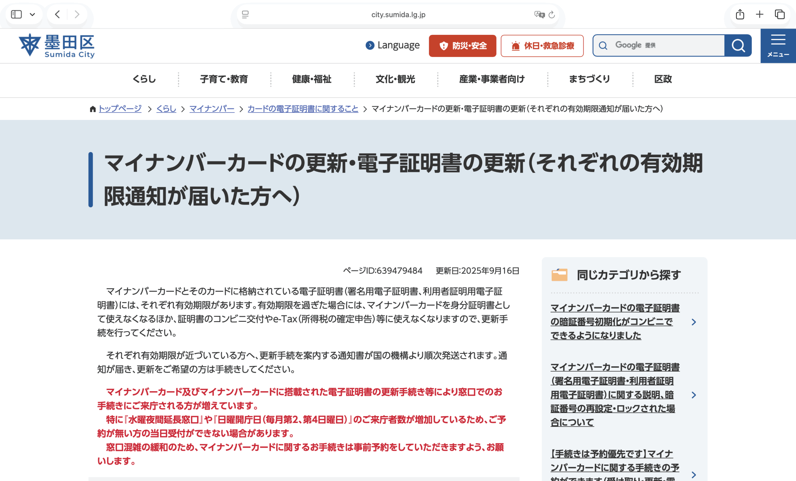 届いたマイナンバーカード・電子証明書有効期限通知書を確認すると、マイナンバーカードの更新なので、電子証明書も更新されたものが納めれているようです。